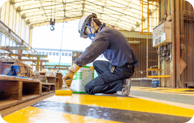 工場・倉庫の床や機械設備、タンクなど幅広い対象へ機能性塗装を実施。防塵・耐摩耗・耐薬品・防錆・耐熱などの性能を付与し、生産環境の安全性と効率を高めます。